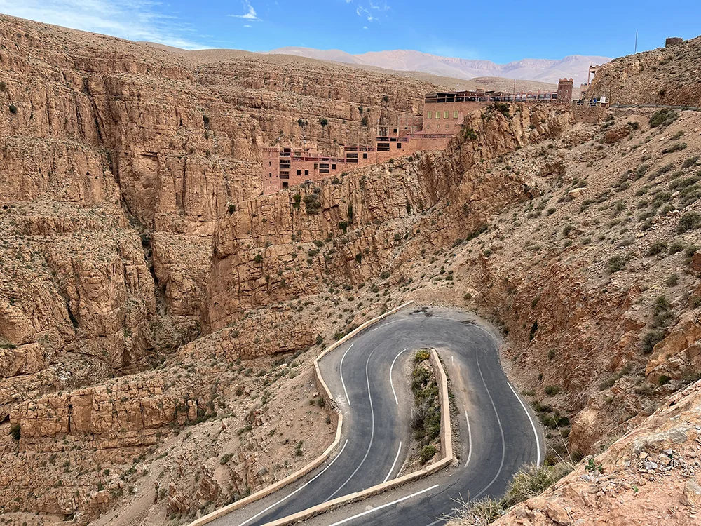 Tras un desayuno energético, nuestras motos están listas. Comienza la ruta por carretera cruzando el majestuoso Col du Tichka, el puerto de montaña más alto de Marruecos (2.260 m), que nos regala un espectáculo de curvas y vistas que se abren paso entre el Alto Atlas. Descendemos hacia Ouarzazate, la “puerta del desierto”, donde visitamos la Kasbah de Taourirt, antigua fortaleza que resistió asedios y guerras tribales. Almorzamos en La Kasbah des Sables, un restaurante con alma y cocina de autor. Por la tarde, el paisaje se torna más árido y mágico mientras avanzamos por el Valle del Dades, entre palmerales y kasbahs centenarias. Llegada al Hotel New Mars, cena y noche de descanso bajo un cielo estrellado.
