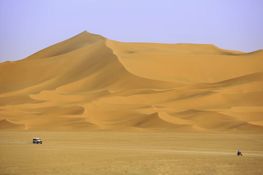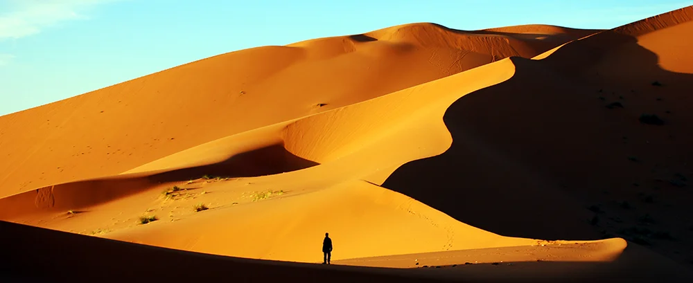 Después del desayuno, rodamos hacia uno de los paisajes más sobrecogedores del viaje: las Gargantas del Todra, un cañón de paredes verticales que se alzan hasta 300 metros. Caminamos entre sus muros mientras sentimos el frescor del agua que fluye en su fondo. Continuamos hacia Erfoud, donde almorzamos. Desde allí, cambiamos las motos por vehículos 4×4 y emprendemos la legendaria Ruta del Dakar hacia el desierto de Merzouga. Al llegar, nos esperan dromedarios para recorrer las dunas al atardecer. El sol se hunde entre arenas doradas mientras cabalgamos hacia nuestro vivac nómada en Golden Camp, donde cenamos bajo las estrellas, rodeados de música bereber y la inmensidad del Sahara.